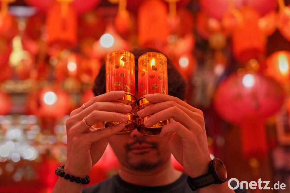 Ein chinesischer Thai betet im chinesischen Tempel Leng Nuei Yee in Bangkok vor dem chinesischen Neujahrsfest.