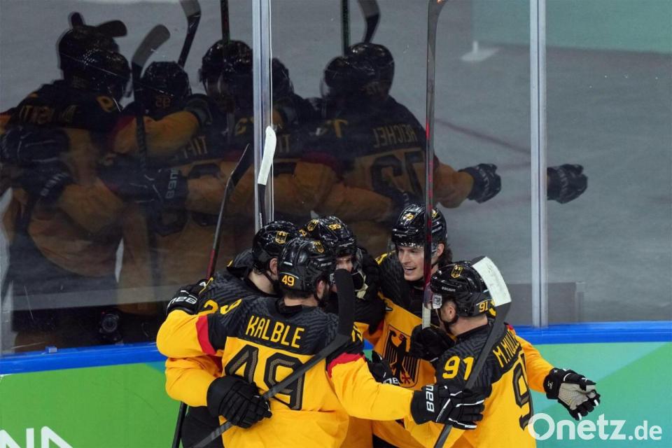 Deutschlands Mannschaft bejubelt das Tor zum 2:0 beim Spiel gegen Frankreich bei den Olympischen Winterspielen Mailand Cortina 2026.