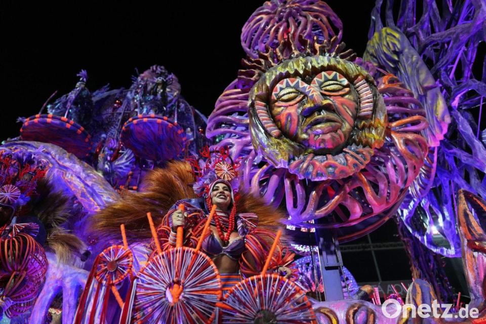 Eine Darstellerin der Sambaschule Grande Rio zieht auf einem Wagen während der Karnevalsfeierlichkeiten im Sambadrom in Rio de Janeiro.