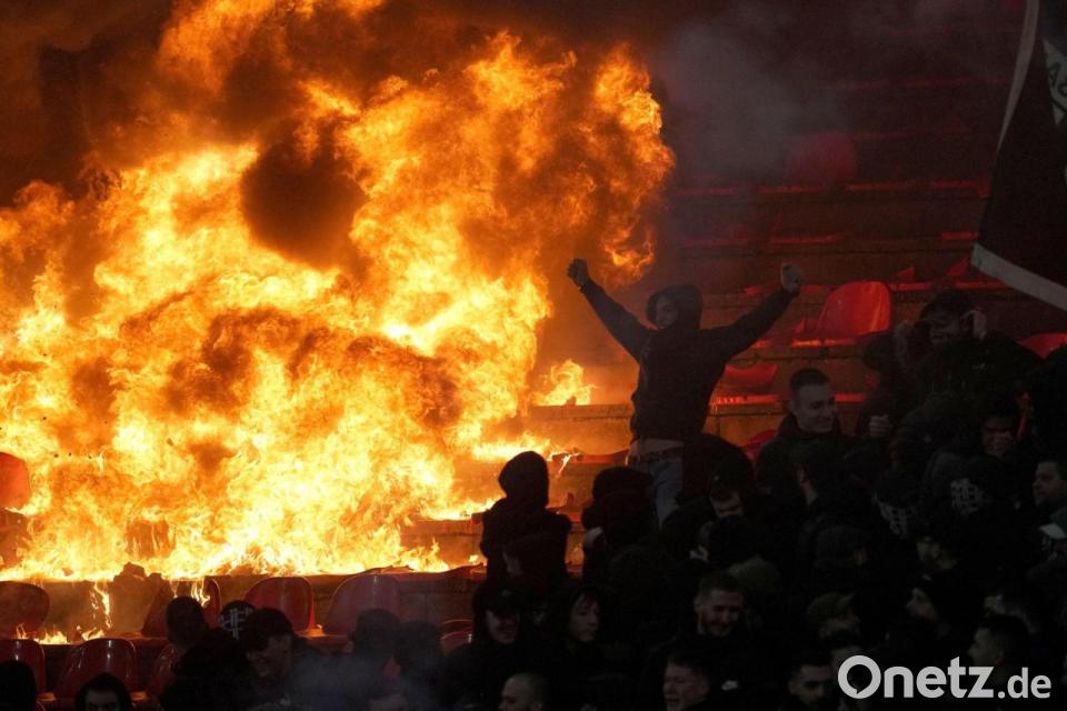 Fans von Partizan Belgrad jubeln vor brennenden Sitzen während des Derbys in der serbischen Fußballliga gegen Roter Stern Belgrad.