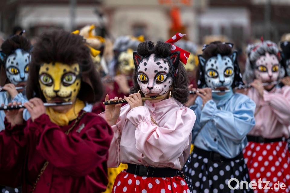Teilnehmer mit Katzenmasken ziehen beim Fasnachts-Umzug in Basel durch die Straßen.