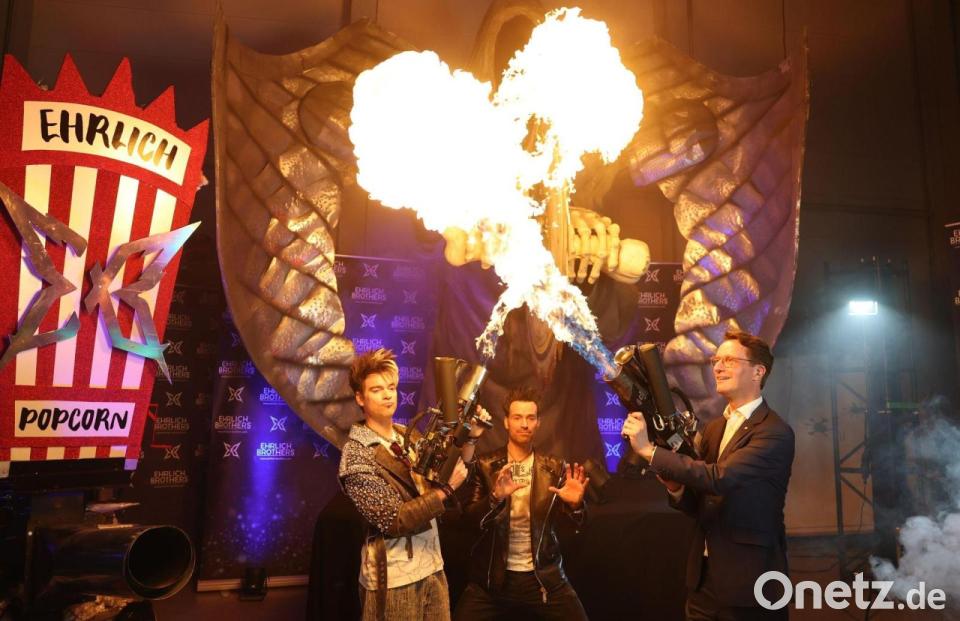 Nordrhein-Westfalens Ministerpräsident Wüst (r) besucht auf seiner Ostwestfalen-Tour die Zauberer „Ehrlich Brothers“ und hält einen Flammenwerfer.