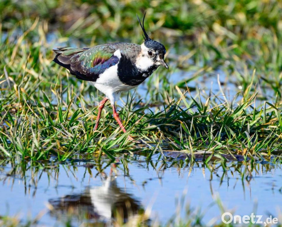 Ein Kiebitz ist auf Nahrungssuche im Oderbruch. Die Vögel gelten auch als Frühlingsboten.