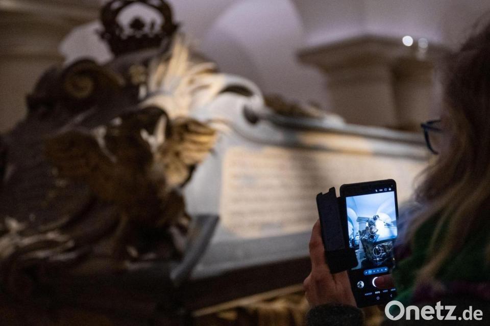 Eine Frau fotografiert am Tag der Offenen Tür anlässlich der Wiedereröffnung der Hohenzollerngruft im Berliner Dom einen Sarg.