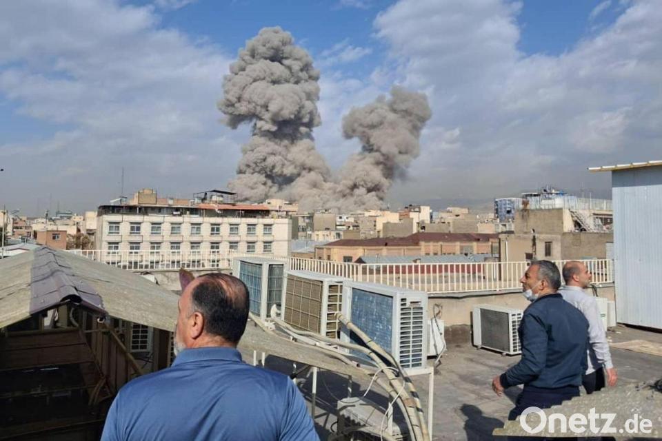 Israel greift den Iran an - Menschen beobachten Rauch nach einer Explosion in Teheran.
