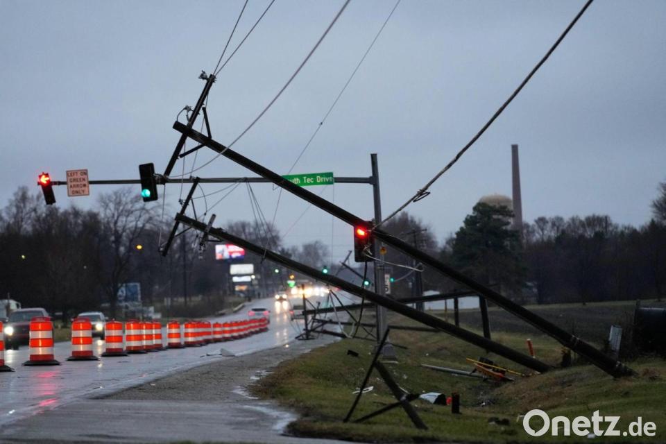 Abgeknickt: Nach einem starken Sturm in Illinois in den USA sind Strommasten beschädigt.
