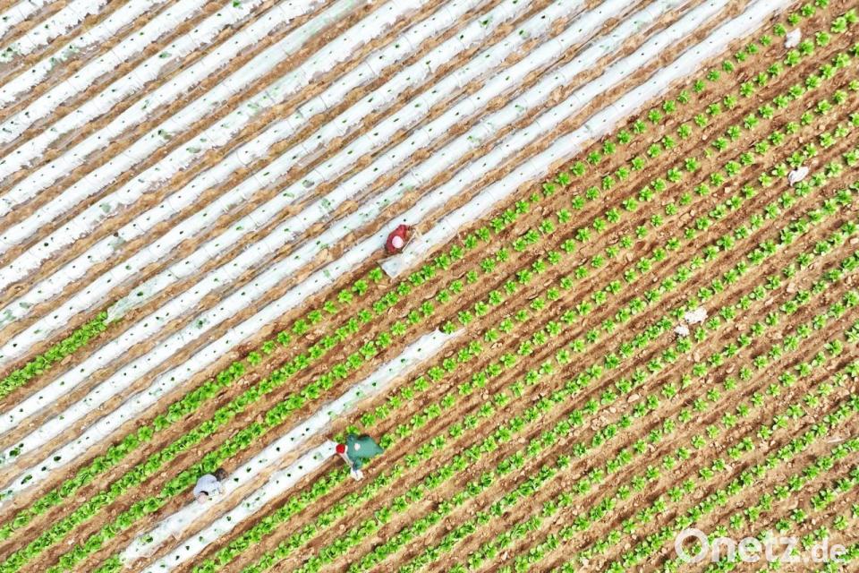 Ein Drohnenfoto zeigt Bauern bei der Arbeit in einem Gemüseanbaugebiet im Kreis Tancheng.