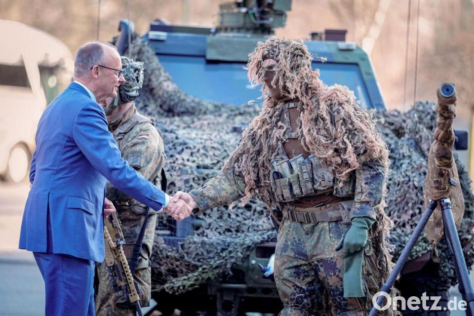 Bundeskanzler Friedrich Merz (l, CDU) wird bei der Verleihung des Fahnenbandes an das Wachbataillon in Berlin von einem Scharfschützen begrüßt.