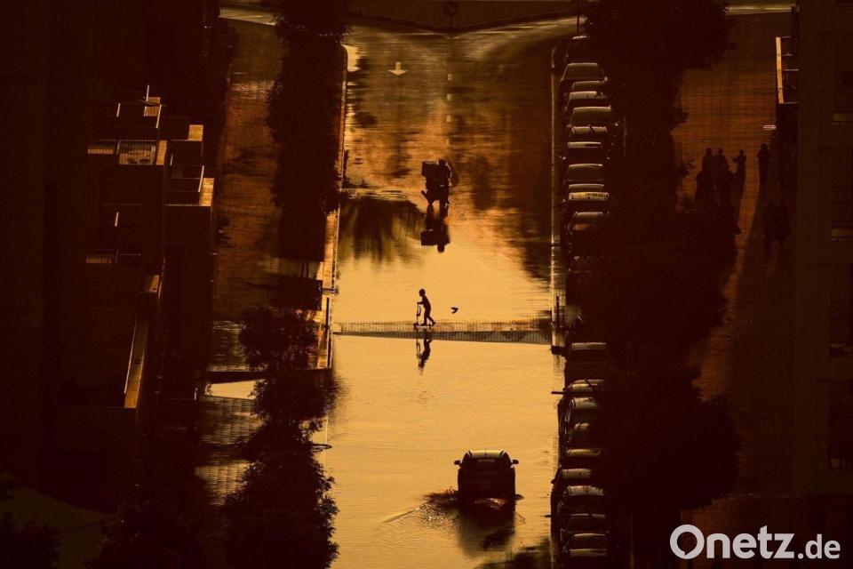Ein Junge überquert eine mit Regenwasser gefüllte Straße in Schardscha, Vereinigte Arabische Emirate.