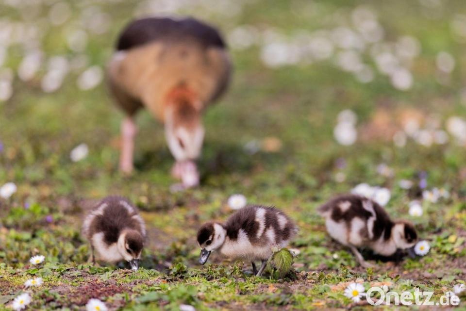 Nilgänse und ihre Küken suchen auf einer Wiese in der Innenstadt von Düsseldorf nach Nahrung.