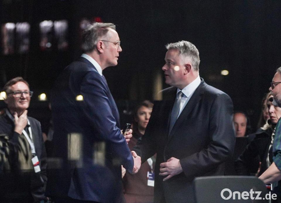Landtagswahl in Rheinland-Pfalz: Ministerpräsident Alexander Schweitzer (l, SPD) gibt Gordon Schnieder (CDU), Landesparteichef, im ARD Fernsehstudio die Hand.
