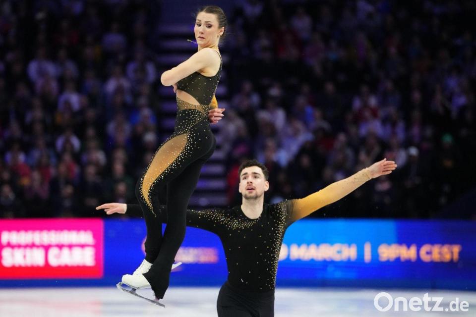 Annika Hocke und Robert Kunkel aus Deutschland treten während des Paarlauf-Kurzprogramms bei den Eiskunstlauf-Weltmeisterschaften in Prag, Tschechien, auf.