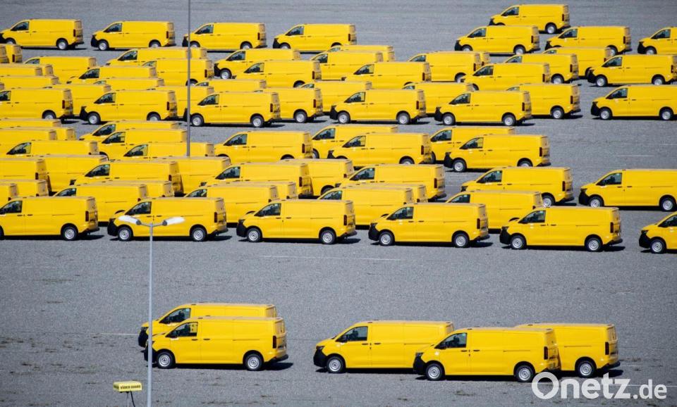 Zahlreiche gelbe Neufahrzeuge vom Typ Volkswagen T7 für die Deutsche Post stehen auf einem Gelände am JadeWeserPort in Wilhelmshaven und werden dort vor Auslieferung zwischengelagert.