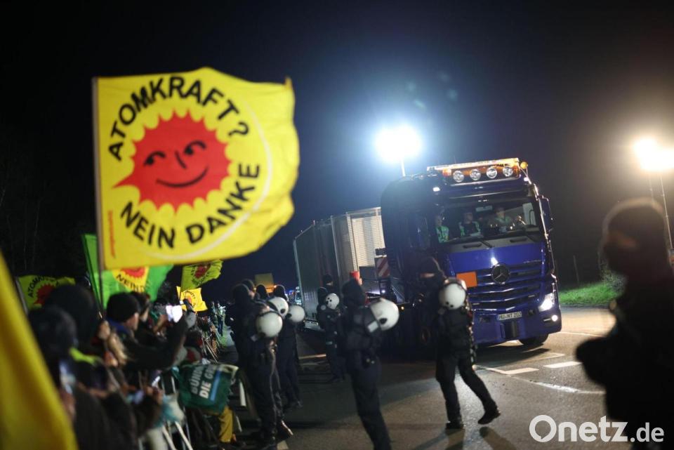 Ein Schwertransporter mit einem Castor-Behälter fährt an Teilnehmer einer Anti-Atomkraft-Demonstration vorbei.