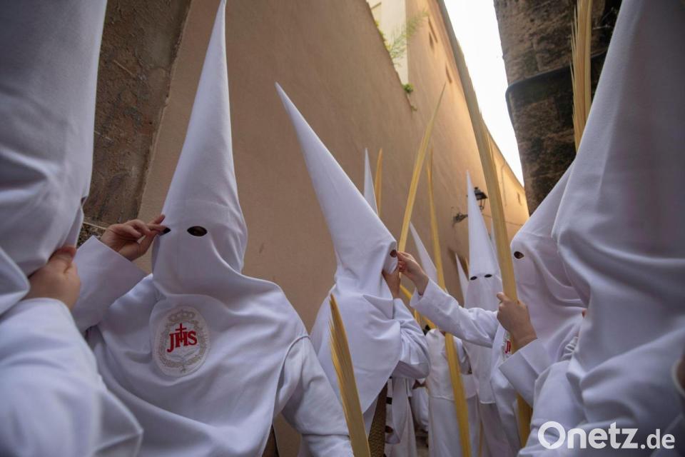 Büßer (Nazarenos) nehmen an einer Prozession am Palmsonntag (Domingo de Ramos) zum Auftakt der Karwoche in Spanien teil.