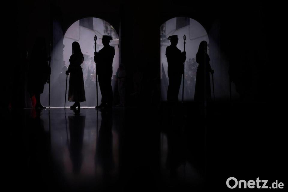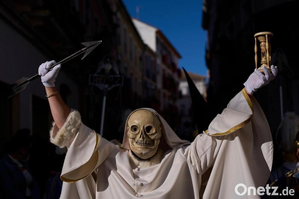 Karfreitagsprozession in Spanien: Büßer der Bruderschaft hebt Geißel und Kreuz