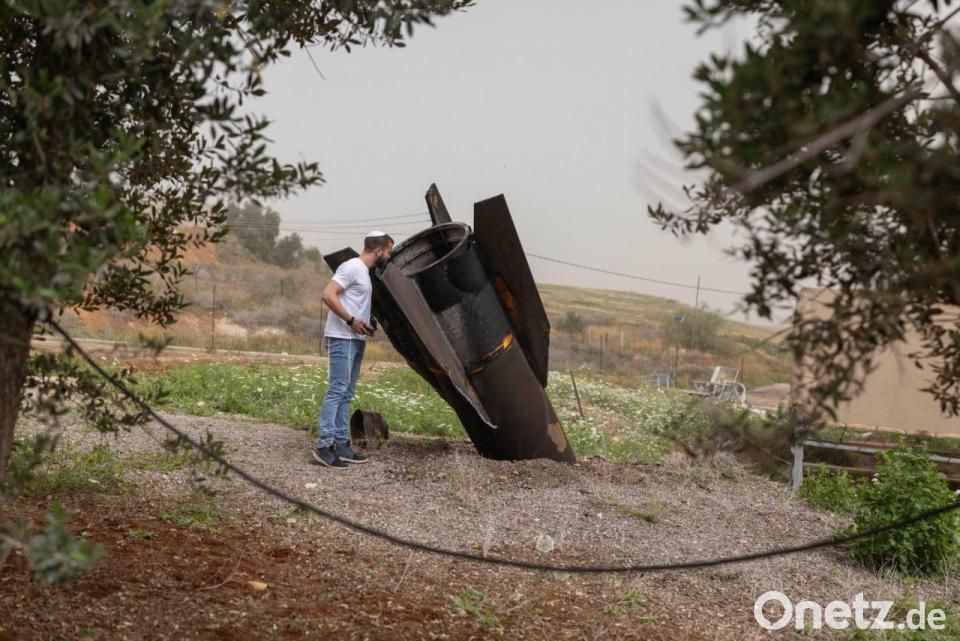 Ein israelischer Mann betrachtet in der jüdischen Siedlung im nördlichen Jordantal das Heckteil einer vom Iran abgeschossenen ballistischen Rakete.