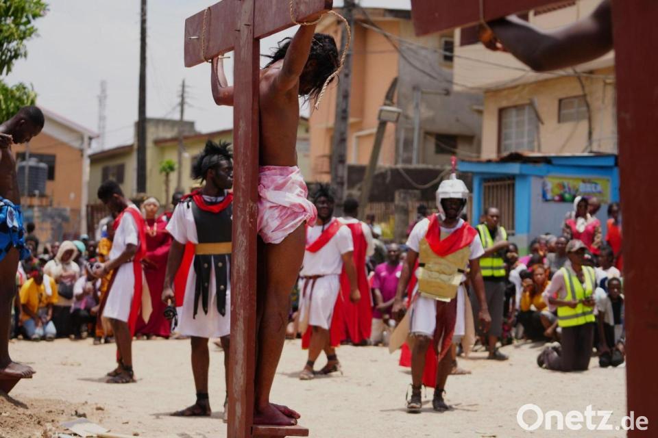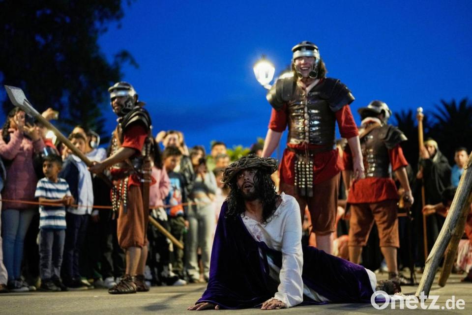 Mitglieder der katholischen Kirche St. Francis nehmen an einer Nachstellung des Kreuzwegs Jesu Christi am Karfreitag teil.