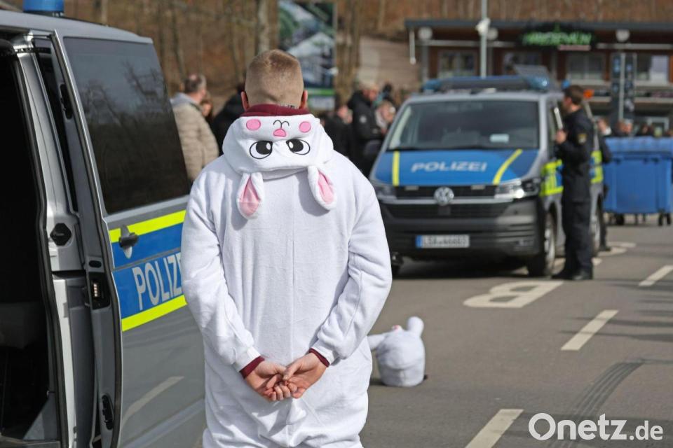 Ein als Osterhase kostümierter Motorradfahrer wird in Blankenburg von Einsatzkräften der Polizei am sogenannten Car-Freitag an der Rappbodetalsperre kontrolliert.