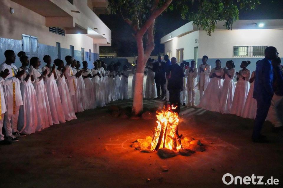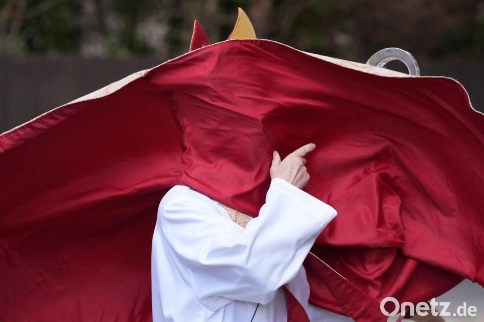 Der Wind fängt die Gewänder der Erzbischöfin von Canterbury, Dame Sarah Mullally, ein, als sie in der Kathedrale von Canterbury in Kent die gesungene Eucharistie zu Ostern leitet.