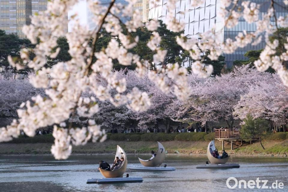 Menschen fahren in Seoul mit Booten in einem Park neben blühenden Kirschblüten.