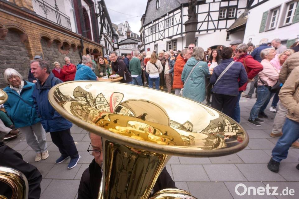 Hunderte Besucher stehen in Winningen auf dem Weinmarkt, um am alten Osterbrauch des „Eierkibbens“ teilzunehmen.