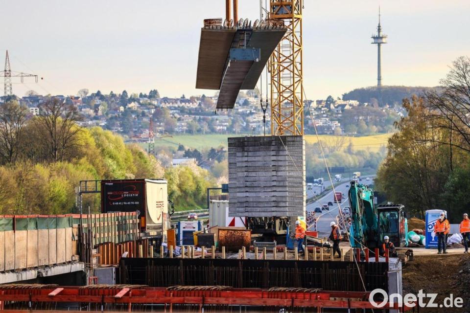 Ein tonnenschweres Stahl-Brückenteil hängt an einer Baustelle der A45 an einem Kran. Wegen Bauarbeiten am Westhofener Kreuz ist die Autobahn am Wochenende in beide Richtungen gesperrt.