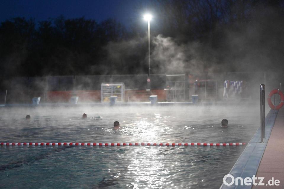 Eindlich geht's los - Frühschwimmer sind schon vor Sonnenaufgang im Wasser des Friesenbads in Weener.
