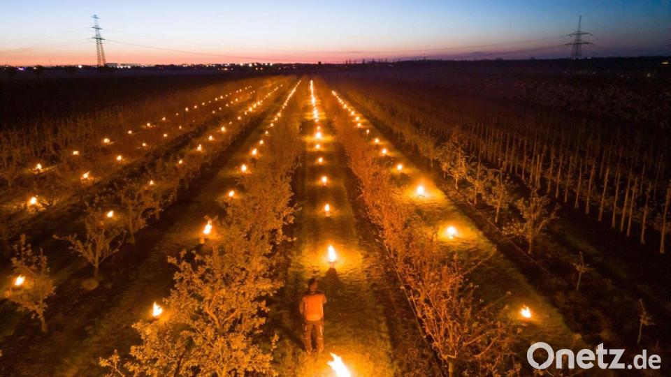 In einer Aprikosen-Plantage in Sachsen-Anhalt brennen Frostschutzkerzen.
