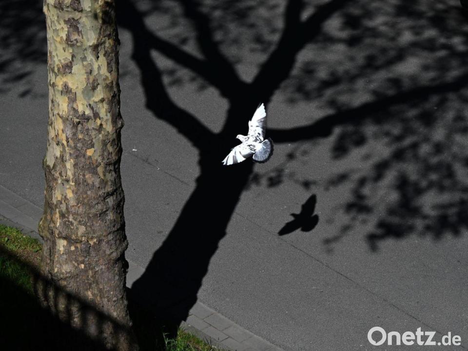 Hell und dunkel, Licht und Schatten: Eine Taube fliegt in Düsseldorf unter einem Baum entlang.