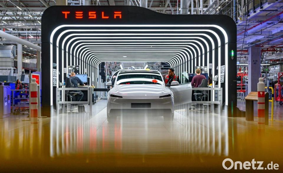 In der Tesla-Autofabrik Berlin-Brandenburg werden Fahrzeuge vom Typ Model Y bei der Endkontrolle geprüft. Tesla will die Anzahl der Mitarbeiter im Werk erhöhen.