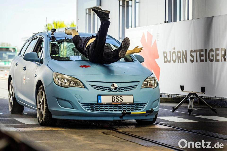 Autsch!! Bei einem Crashtest wird ein Frontalunfall mit einem Dummy und einem Pkw in Münster simuliert.