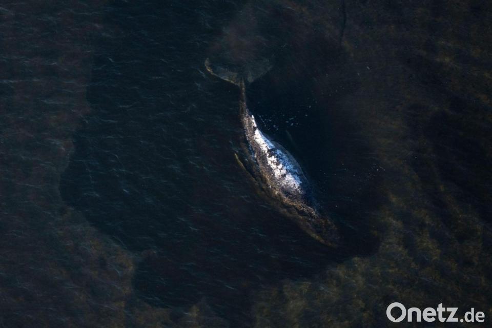 Der Buckelwal liegt in einer ausgespülten Mulde im Wasser vor der Insel Poel (Aufnahme aus einem Flugzeug).
