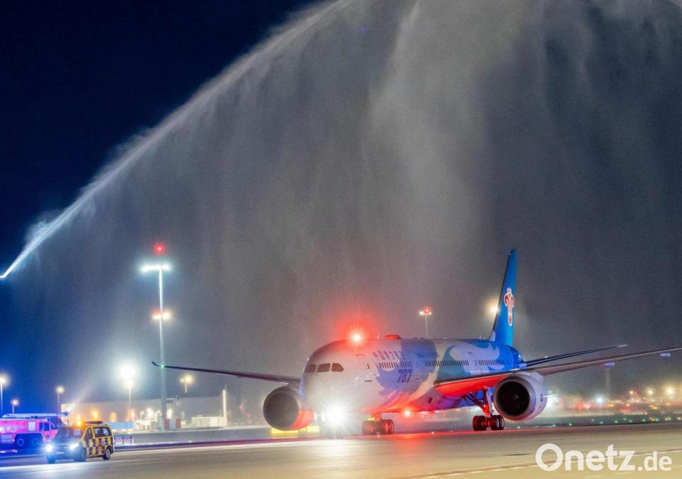 Eine Passagiermaschine von China Southern Airlines, die als erste das neue Terminal 3 angeflogen hat, wird mit Wasserfontänen am Flughafen Frankfurt begrüßt.