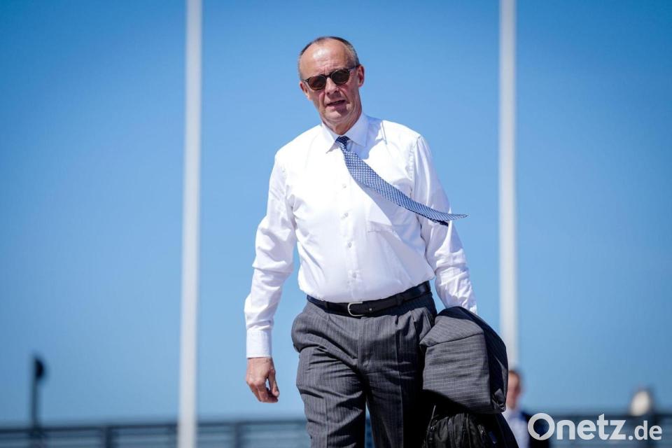 Mit wehendem Schlips und Sonnenbrille: Bundeskanzler Merz geht auf dem militärischen Teil des Flughafens BER zum Airbus A321 der Luftwaffe, um nach Zypern zu fliegen.