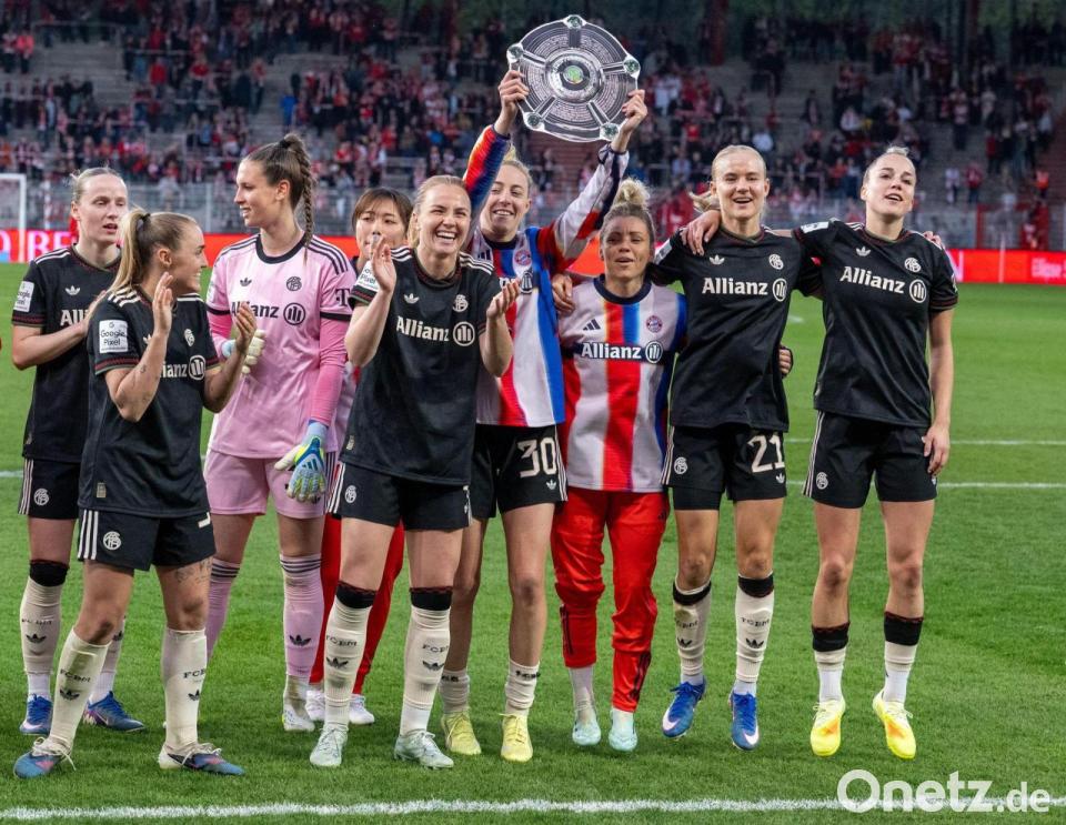 Bayern Münchens Spielerinnen jubeln nach dem Spiel gegen den 1. FC Union Berlin mit der Nachbildung einer Meisterschale über den Sieg.