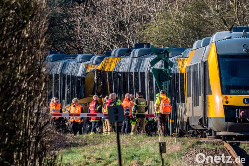 Nach einem Zugunfall mit mehreren Verletzten in Dänemark sind Rettungskräfte an der Unfallstelle im Einsatz.