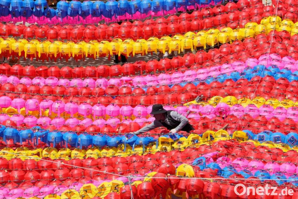Ein Arbeiter arrangiert Laternen für die bevorstehenden Feierlichkeiten zu Buddhas Geburtstag in der südkoreanischen Hauptstadt Seoul.