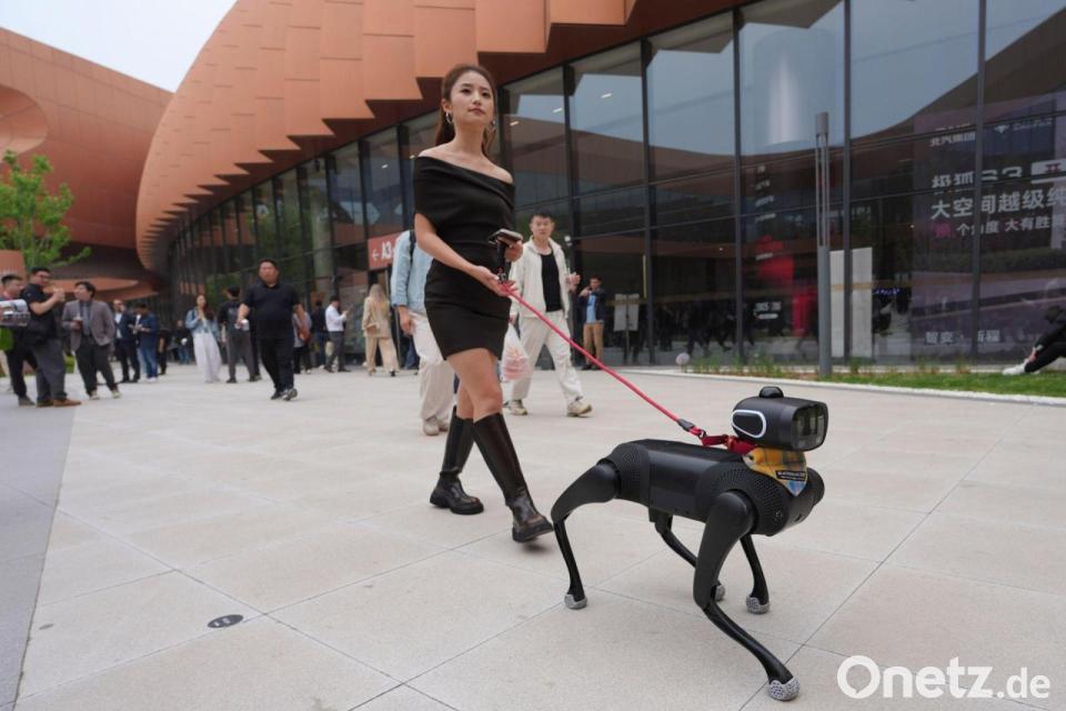 Hundesteuer gespart: Eine Frau geht mit einem Roboterhund während der Messe Auto China 2026 in Peking spazieren.