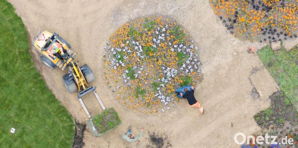 Gärtner pflanzen Blumen auf dem Gelände der Landesgartenschau 2026 in Bad Nenndorf.