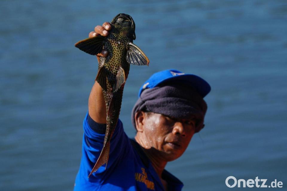 Ein Mann hält einen Harnischwels hoch, den er während einer Aktion zur Entfernung invasiver Arten aus den Flüssen, Kanälen und Wasserreservoirs der indonesischen Hauptstadt Jakarta gefangen hat.