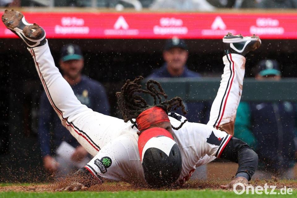 Schlagmann der Minnesota Twins, Josh Bell, rutscht sicher auf die Home Plate.