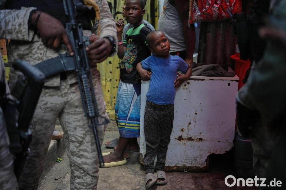 Kind neben bewaffnetem Polizisten in Unterkunft für Vertriebene in Port-au-Prince