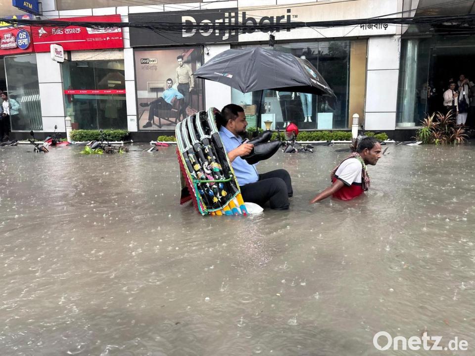 Die Schuhe bleiben trocken: Ein Mann lässt sich in Bangladesch in einer Rikscha durch eine überflutete Straße fahren.
