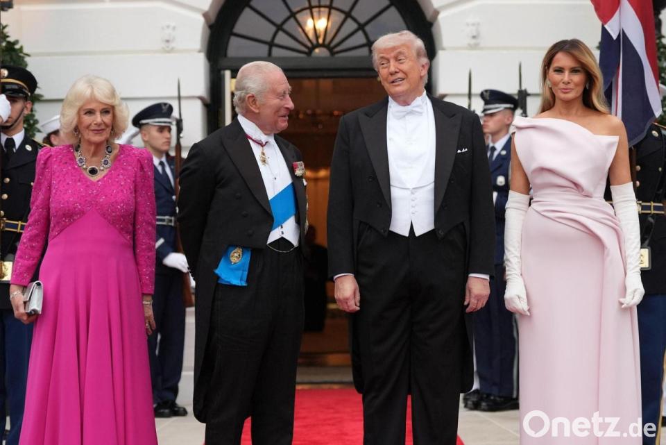US-Präsident Donald Trump und First Lady Melania Trump begrüßen den britischen König Charles III. und Königin Camilla am Südportikus.