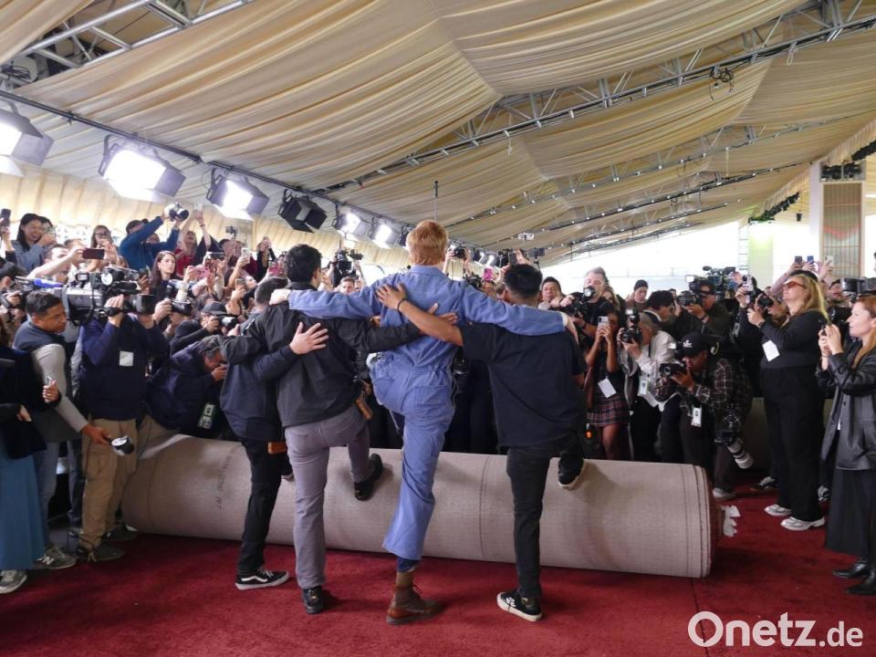 In wenigen Tagen laufen hier Filmstars und Oscar-Gäste entlang: Für die Trophäen-Show sind auf dem Hollywood Boulevard die ersten Rollen des roten Teppichs ausgelegt worden. Den traditionellen „Roll Out“ verfolgten Hunderte Kamerateams und Fotografen mit. Ein berühmter Gast, der am Sonntag auf der Bühne stehen wird, packte mit an.