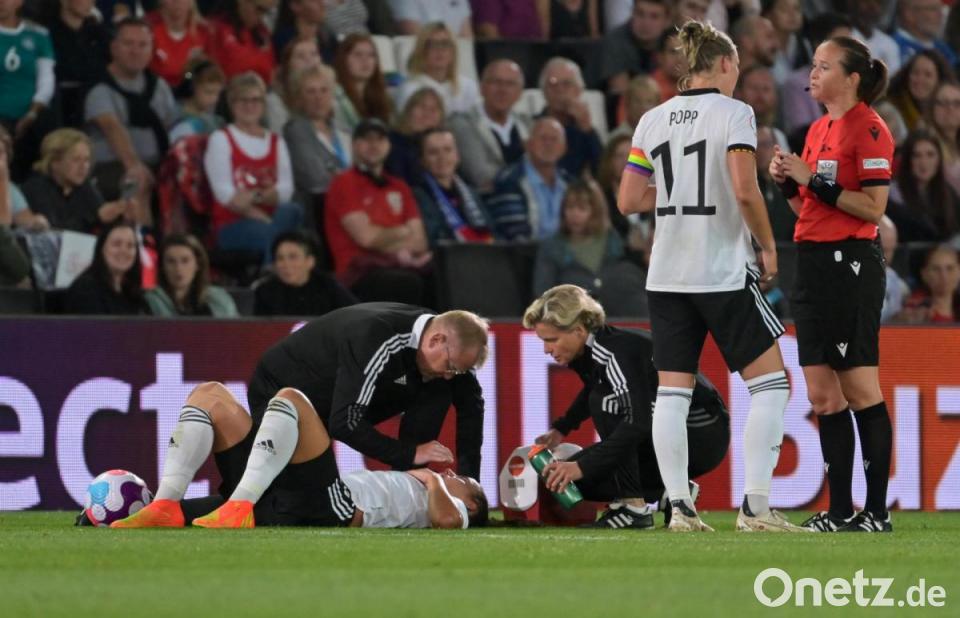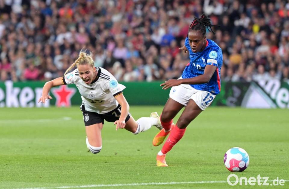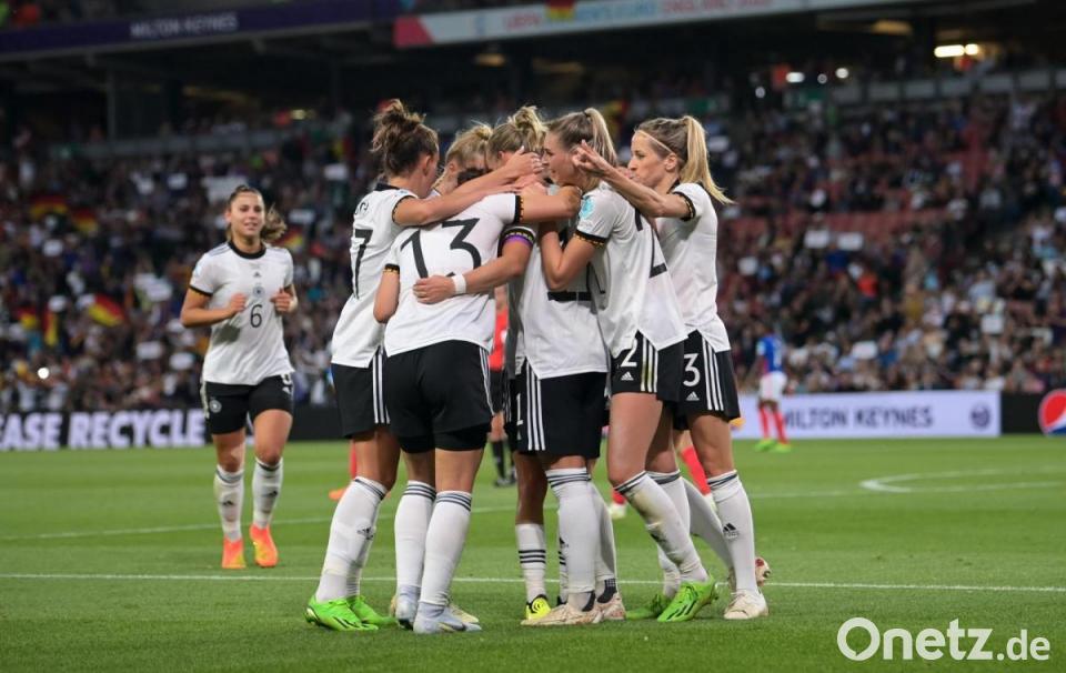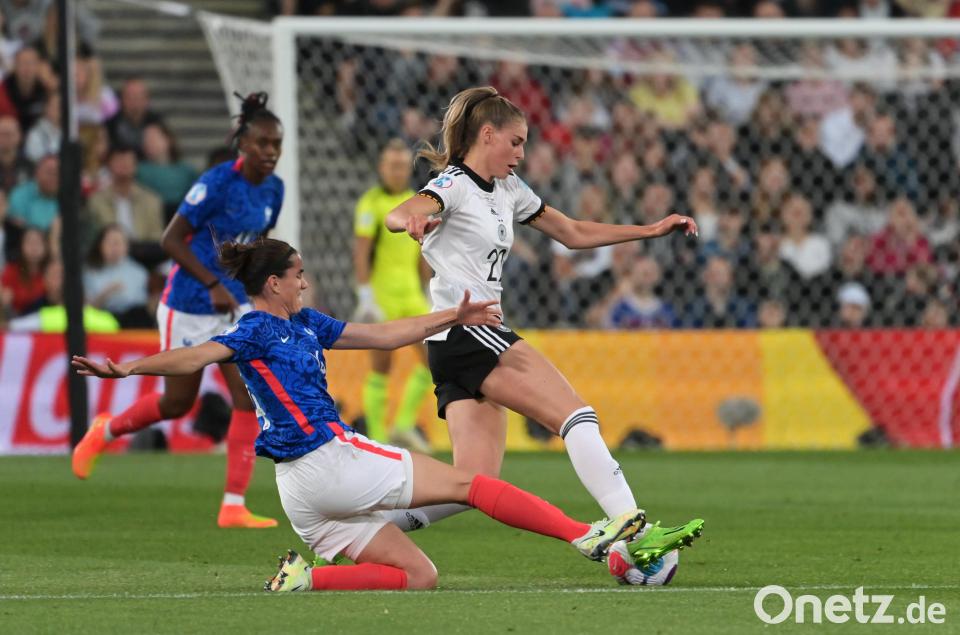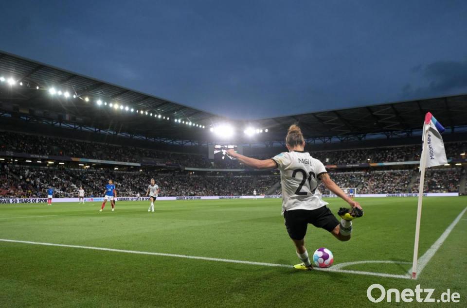 Ein von Brand herausgeholter Freistoß brachte dann die erste Chance: Torhüterin Pauline Peyraud-Magnin lenkte den Ball von Popp gerade noch um den Pfosten (22.). Vor den Augen von Bundesinnenministerin Nancy Faeser sowie DFB-Präsident Bernd Neuendorf und -Direktor Oliver Bierhoff übernahmen die deutschen Frauen immer mehr die Initiative.