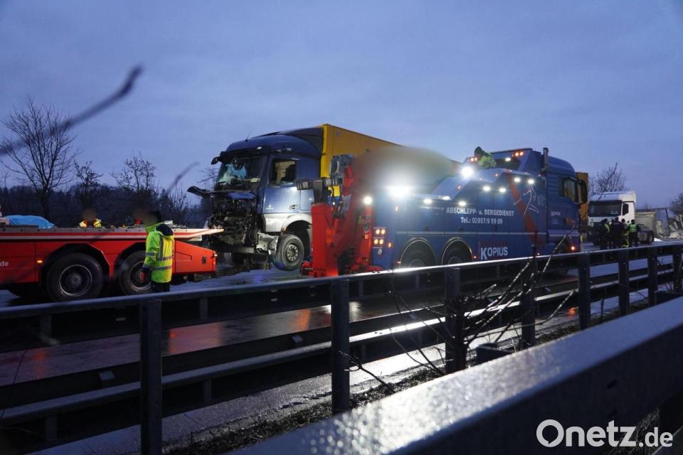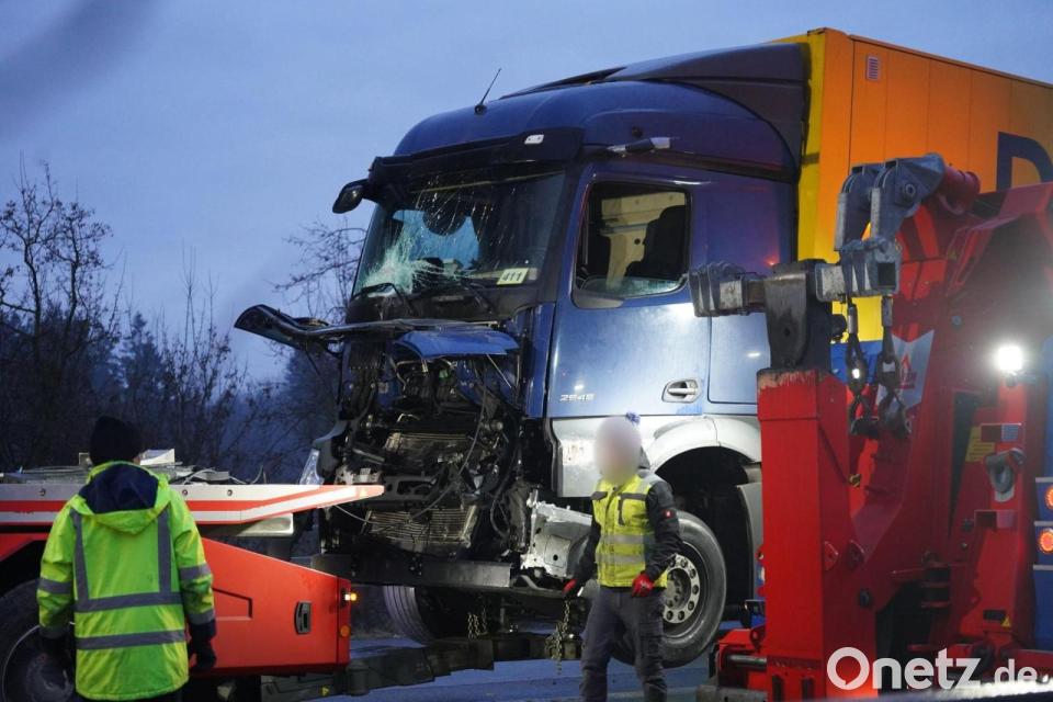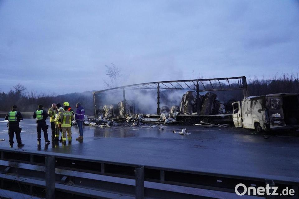 Gegen 1.30 Uhr meldeten mehrere Verkehrsteilnehmer der Polizei Unfälle aufgrund von Straßenglätte. Wie die Polizei weiter berichtete, kam es zu einem Unfall mit einem Lastwagen und einem mit Papier beladenen Sattelaufleger. Der Sattelaufleger brannte. Der Fahrer des Lastwagens konnte den Angaben zufolge nicht mehr aus dem Führerhaus geborgen werden und starb an der Unfallstelle. Der Fahrer des Sattelzugs kam ins Krankenhaus.