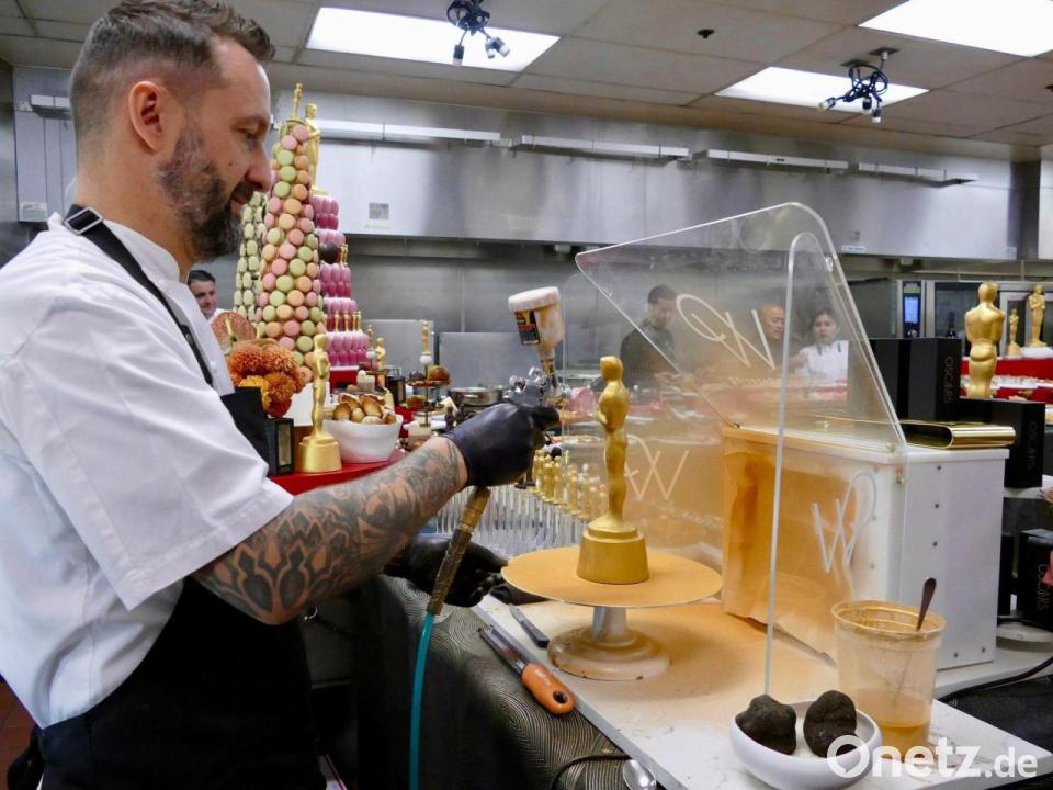 Natürlich gibt es bei den 98. Academy Awards auch wieder süße Trostpreise. Der französische Konditor Garry Larduinat richtet ein Sprühgerät auf eine Oscar-Statue aus feinster Bitterschokolade. Bis Sonntagabend werden 3.000 davon mit essbarem Gold bestäubt. „Das ist noch eine Menge Arbeit“, sagt Larduinat mit einem Augenzwinkern. Doch kein Gast soll ohne einen Oscar nach Hause gehen.