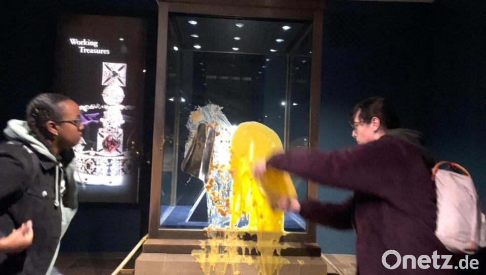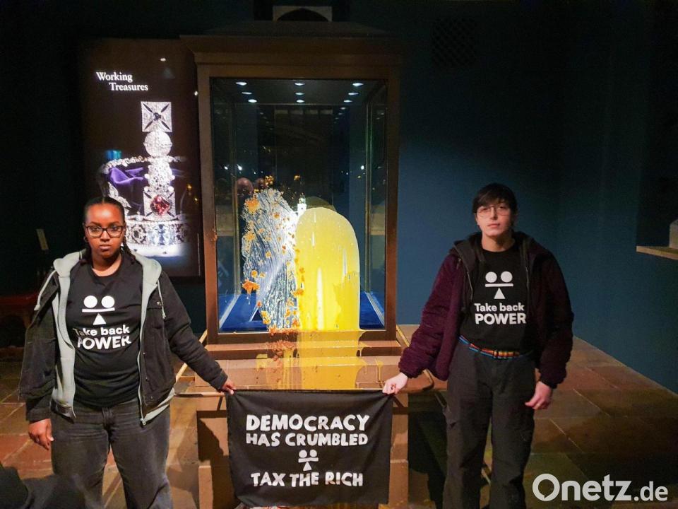 Es ist ein normaler Samstagmorgen, ehrfürchtig schreiten Dutzende Touristen durch die abgedunkelten Ausstellungsräume mit den britischen Kronjuwelen im Tower of London. Doch plötzlich packt jemand ein Kuchenblech aus und verteilt den Inhalt auf der Vitrine der Imperial State Crown. Ein zweiter Aktivist schüttet eine Flüssigkeit hinterher, mutmaßlich Vanillesoße. Symbolischer kann eine Protestaktion das Vereinigte Königreich kaum treffen.